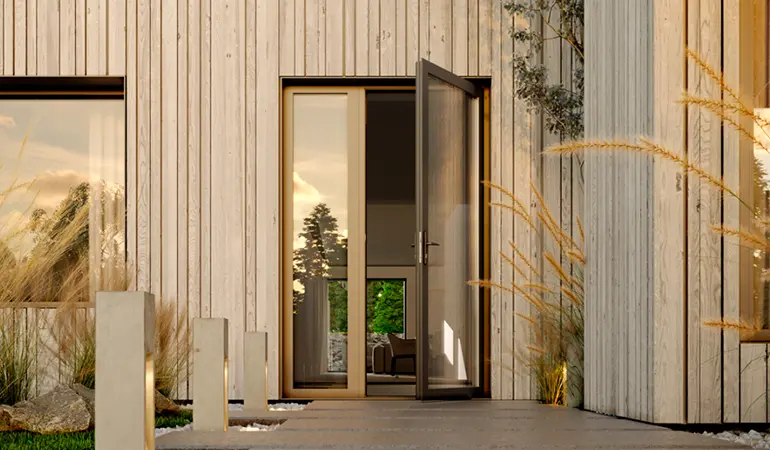 Установленные решения: окна, двери, порталы; цвет профилей: матовый антрацитово-серый
