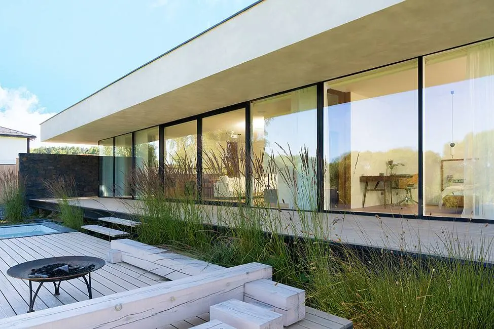 Установленные решения: фасады, окна, двери; цвет профилей: матовый черный