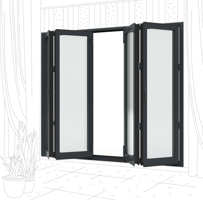 3 складные створки в одну сторону, открывание наружу, цвет: антрацит матовый, 2400×2700 мм, двухкамерный стеклопакет с энергоэффективным закаленным стеклом.