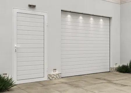 Боковые двери изготавливаются из тех же панелей, что и ворота. Благодаря этому они гармонично сочетаются между собой, а фасад гаража приобретает завершенный вид.