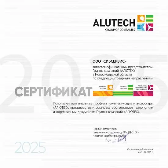 Спасибо компании Сибсервис за качественную продукцию от Алютех. + еще свой сервисный центр у них есть. Это вдвойне больше гарантия.