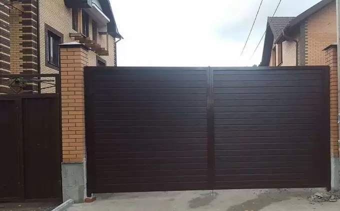 Сдвижные ворота серии Prestige Рама: 96 мм. Комбинированное заполнение: сэндвич-панель L-гофр и разреженный профиль 37 мм. цвета «Шоколад» (RAL 8017). Автоматика ALUTECH Roteo